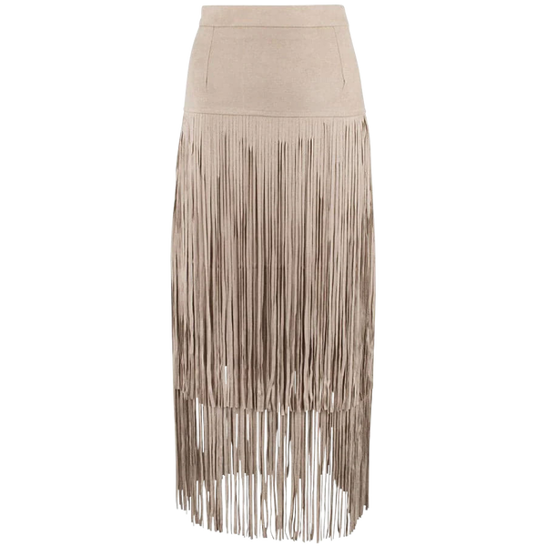 Adore Faux Suede Long Fringe Skirt: Western style fringe skirt with hidden back zipper